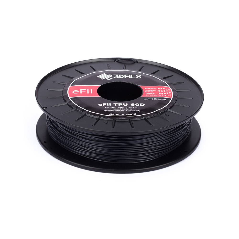 eFil TPU 60D pertenece a la familia eFil de filamentos flexibles basados en TPU. Su dureza es Shore 60D, superior a la dureza estándar de los filamentos flexibles para impresión 3D del mercado. La dureza 60D es la que podemos encontrar en piezas de goma dura, además de contar con más elongación. Esta mayor dureza permite trabajar con filamentos flexibles con la ventaja de una mayor facilidad de impresión.