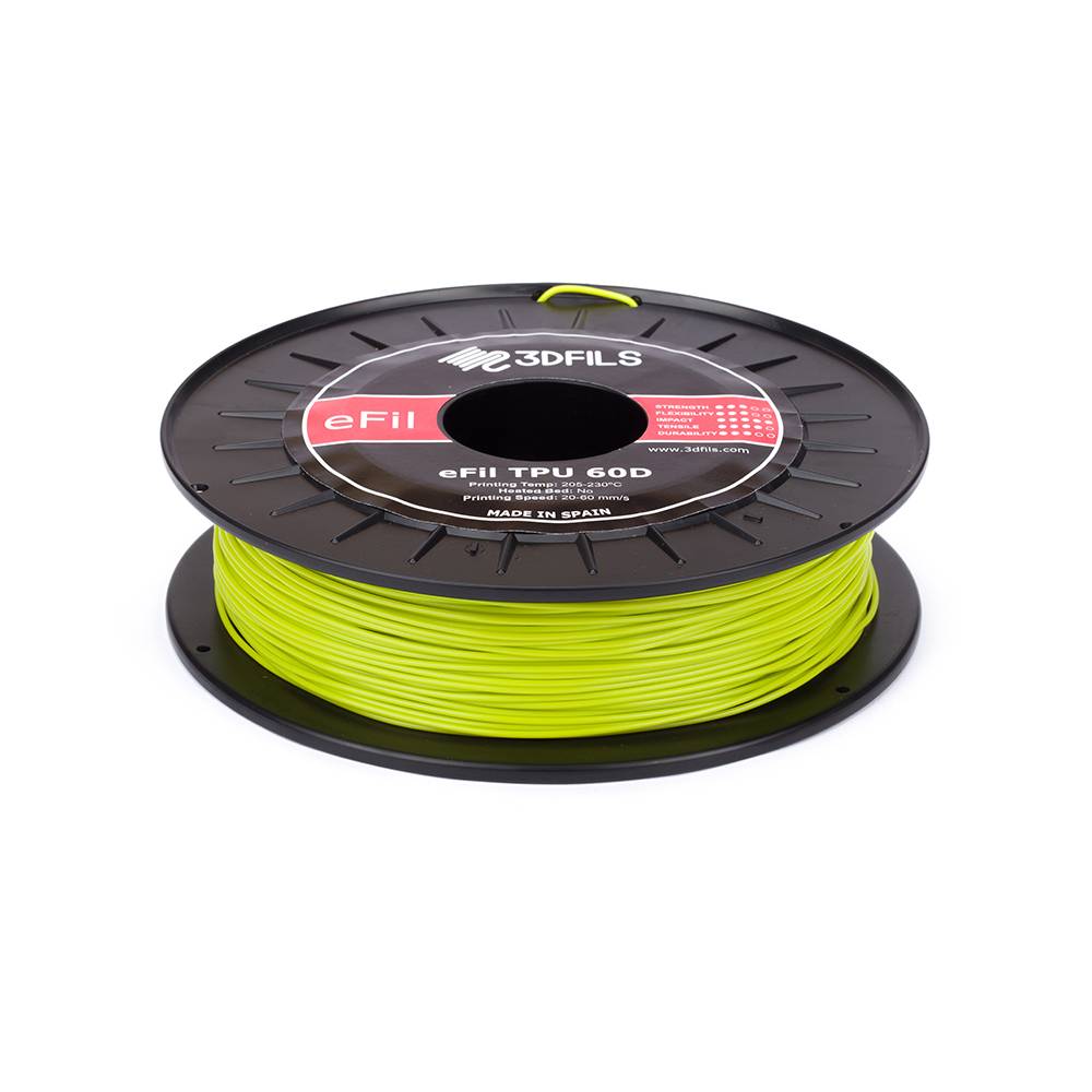 eFil TPU 60D pertenece a la familia eFil de filamentos flexibles basados en TPU. Su dureza es Shore 60D, superior a la dureza estándar de los filamentos flexibles para impresión 3D del mercado. La dureza 60D es la que podemos encontrar en las piezas LEGO, además de contar con más elongación. Esta mayor dureza permite trabajar con filamentos flexibles con la ventaja de una mayor facilidad de impresión.