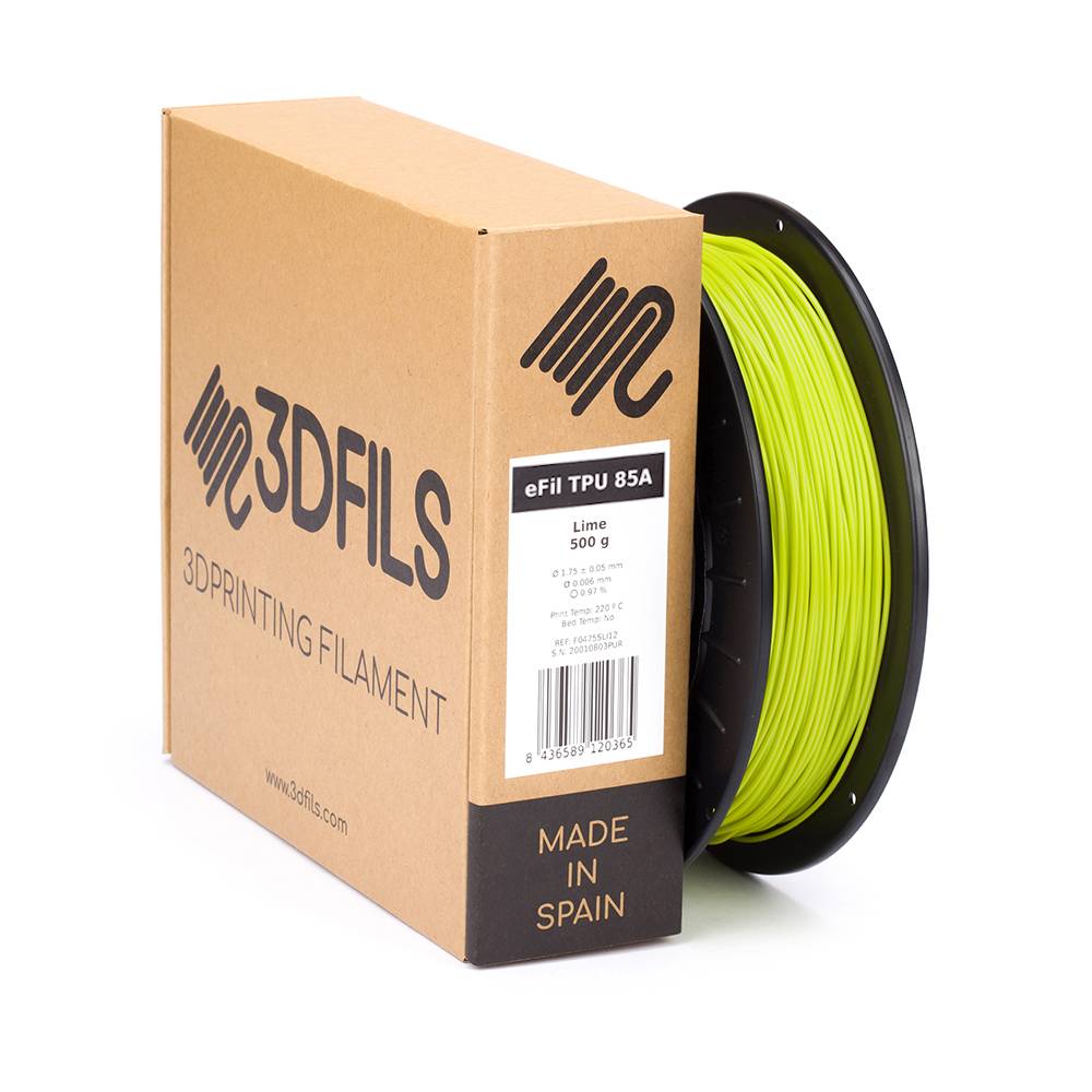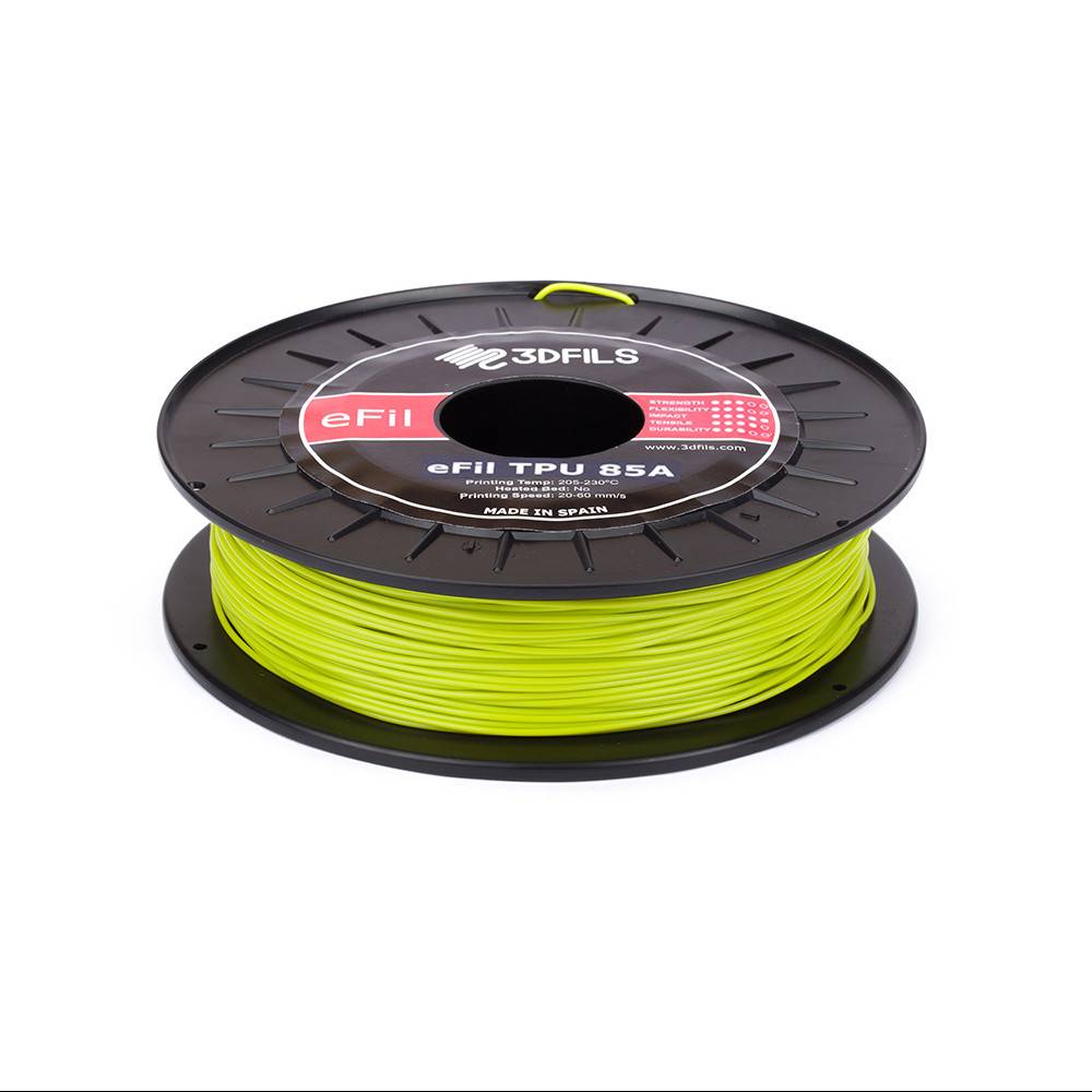 El eFil TPU 85A cuenta con unas excelentes propiedades de resistencia química tanto a ácidos como a bases, así como a una gran variedad de disolventes. Posee también una excelente resistencia a la abrasión, impactos y perforaciones y puede resistir temperaturas hasta 100ºC. Por otra parte, cuenta con una gran adhesión, por lo que su impresión no presenta problemas de warping, incluso sin cama caliente u otros métodos de fijado. Esta gran adhesión otorga una perfecta unión entre capas, produciendo piezas mucho más resistentes al desgarro. Su resistencia tensil alcanza los 33 MPa y la resistencia al impacto es de 100 N/mm.